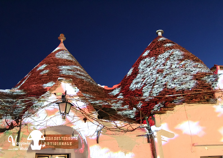 Ma ecco che, dopo il tramonto, il paese si trasforma in un villaggio incantato. Ad Alberobello si accende il Natale, sui trulli e sulle facciate del paese vengono proiettate stelline, fiocchi di neve e motivi natalizi per creare un’atmosfera fiabesca tutta da vivere.